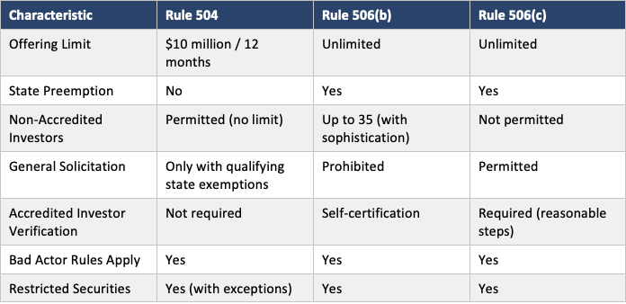 Understanding how Rule 504 compares to Rules 506(b) and 506(c) helps identify when each exemption is most appropriate: