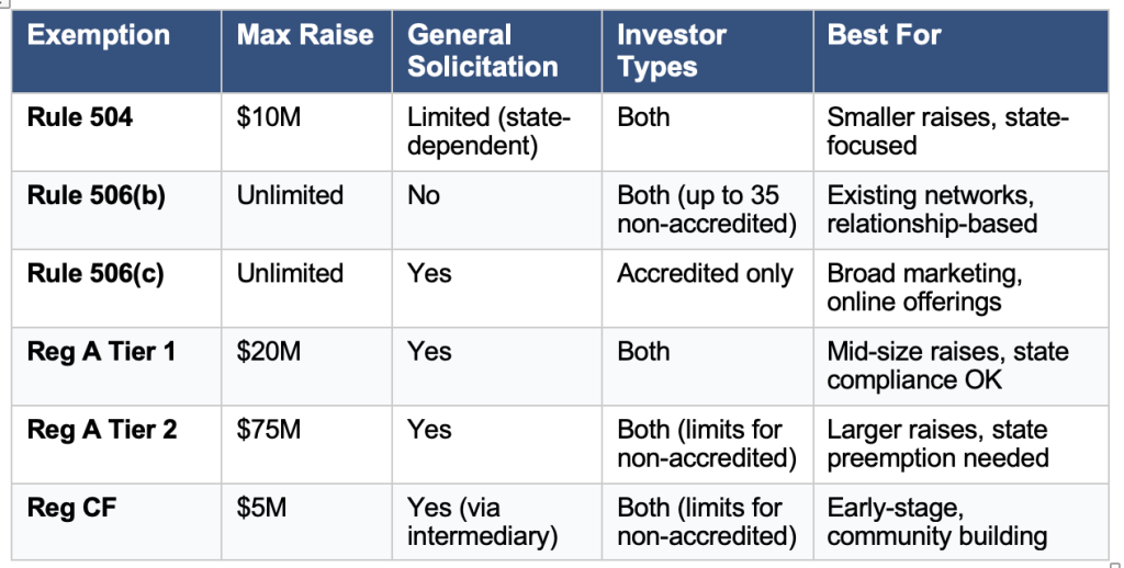 Selecting an exemption isn’t purely a compliance exercise—it’s a strategic decision that affects your fundraising approach and investor relationships. Consider these factors: